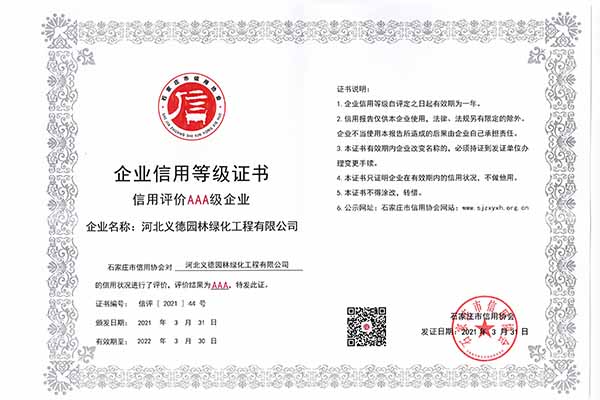 近幾年來我公司被授予2019年-2022年河北省扶貧龍頭企業(yè)、2018年國家林業(yè)標準化示范企業(yè)、2019年度全國苗圃50強、2018-2019年度河北省林業(yè)重點龍頭企業(yè)、2018年保定市精品特色現(xiàn)代農(nóng)業(yè)園區(qū)、2018年度保定林木種苗協(xié)會授予特色苗圃、2018年度北方十佳特色苗圃、2016-2019年河北省建設工程招標投標誠實守信5A級施工企業(yè)等榮譽稱號,2017年保定市林木種苗龍頭企業(yè)、石家莊市2017年度優(yōu)秀園林企業(yè)。